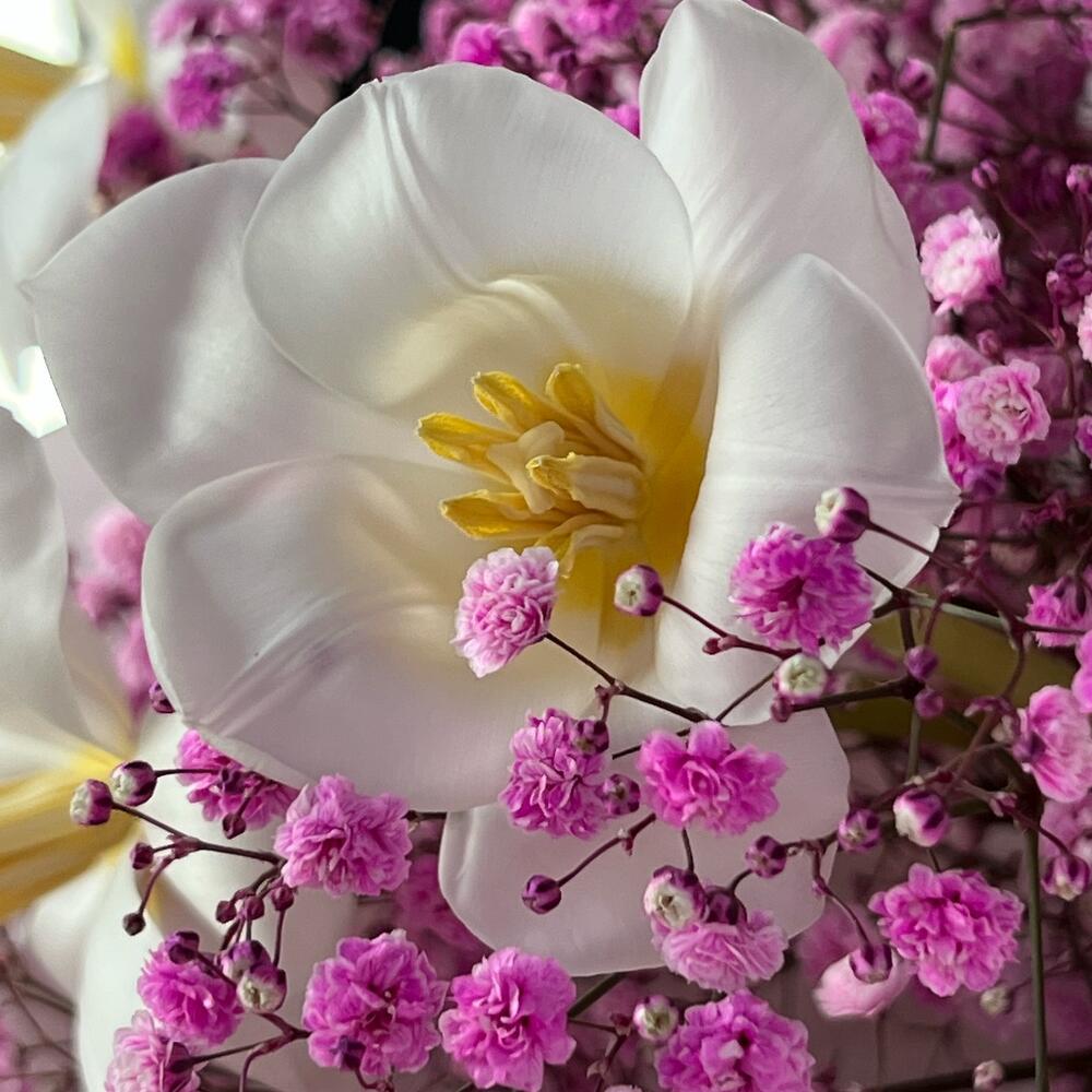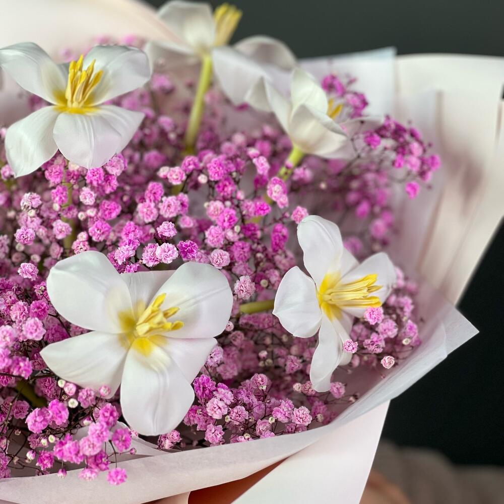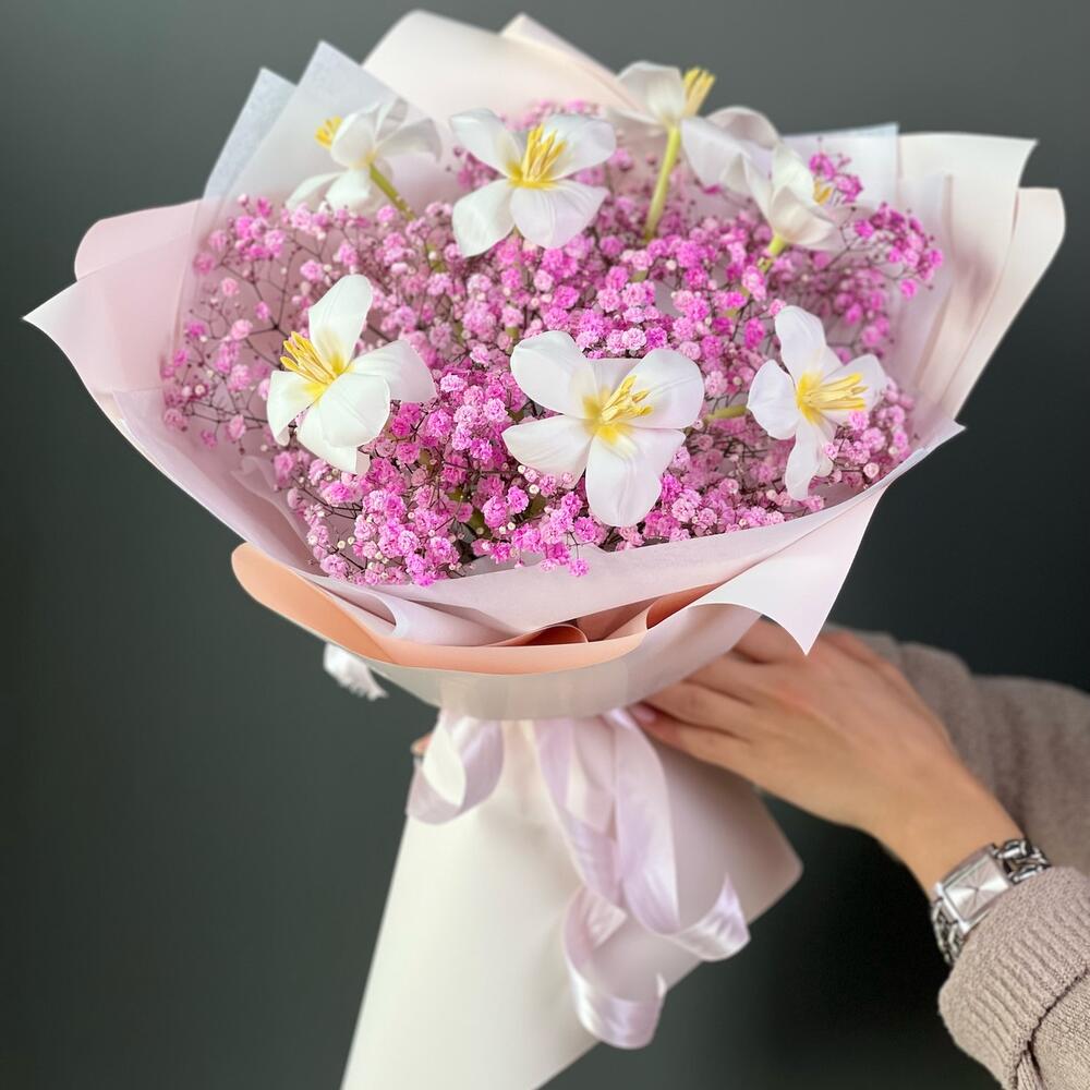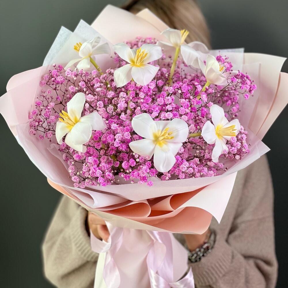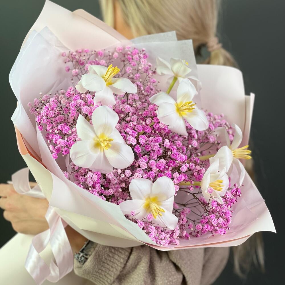 Авторский букет «Весеннее настроение» из стойких тюльпанов и гипсофилы 💗